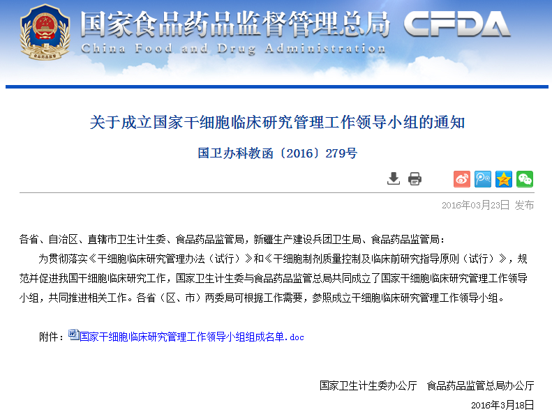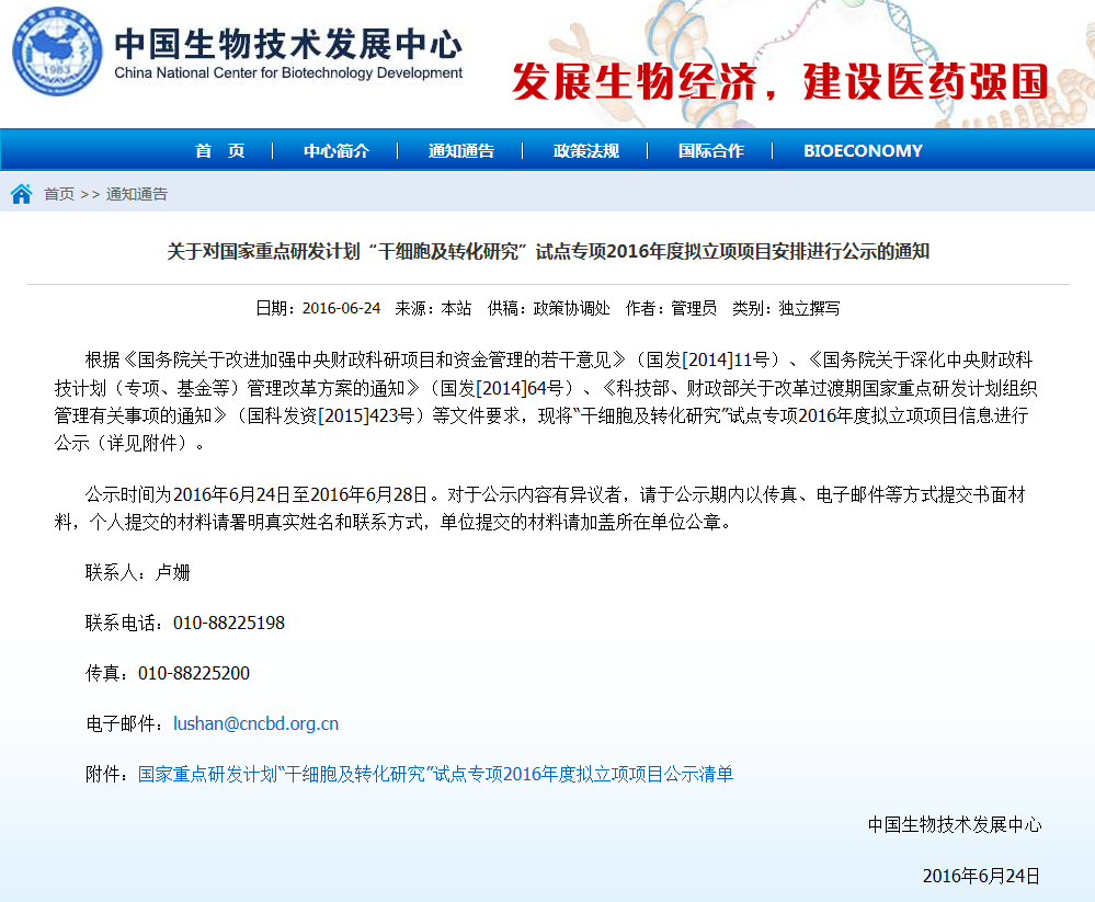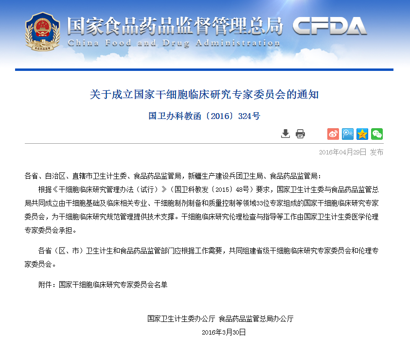 按照《干細(xì)胞臨床研究管理辦法(試行)》要求,國家干細(xì)胞臨床研究專家委員會(huì)對(duì)各地報(bào)送的干細(xì)胞臨床研究機(jī)構(gòu)備案材料進(jìn)行了審核,根據(jù)專家委員會(huì)意見,形成了干細(xì)胞臨床研究機(jī)構(gòu)首批通過備案的建議名單(見附件)。 從即日起至2016年6月8日對(duì)擬備案機(jī)構(gòu)進(jìn)…