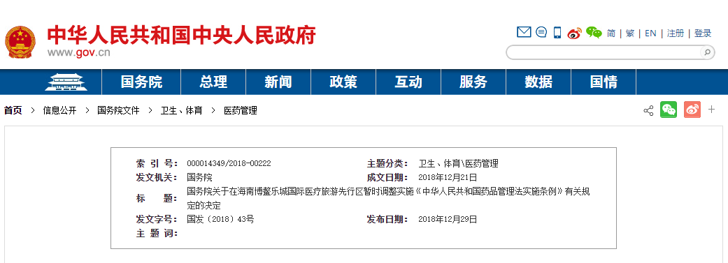 近日,國(guó)務(wù)院發(fā)布《關(guān)于在海南博鰲樂(lè)城國(guó)際醫(yī)療旅游先行區(qū)暫時(shí)調(diào)整實(shí)施<中華人民共和國(guó)藥品管理法實(shí)施條例>有關(guān)規(guī)定的決定》。國(guó)務(wù)院決定,在海南博鰲樂(lè)城國(guó)際醫(yī)療旅游先行區(qū)暫時(shí)調(diào)整實(shí)施《中華人民共和國(guó)藥品管理法實(shí)施條例》第三十六條的規(guī)定,對(duì)先行…